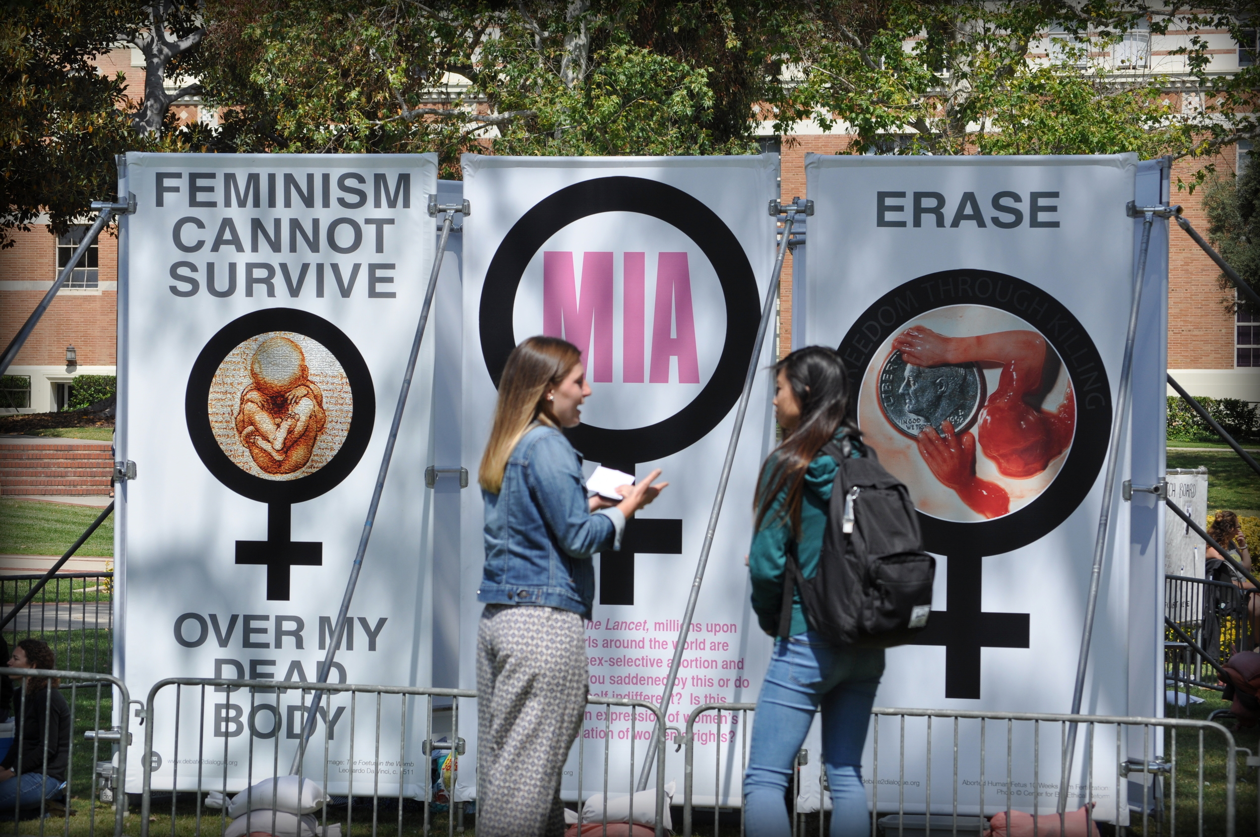 From far away, the meaning of the panel is ambiguous. The word "Erase" is seen above the symbol for feminism and an image of the limbs of an aborted fetus. A closer view, though, reveals grey text inset in the feminism symbol: "freedom through killing." Is the killing of abortion accomplishing freedom and the ideals of feminism or erasing them?