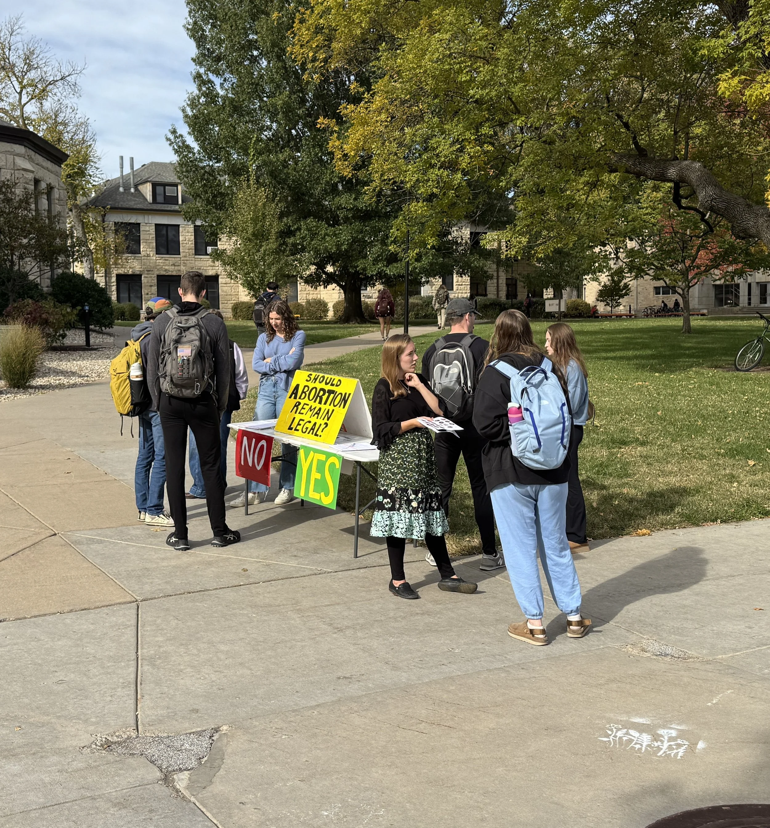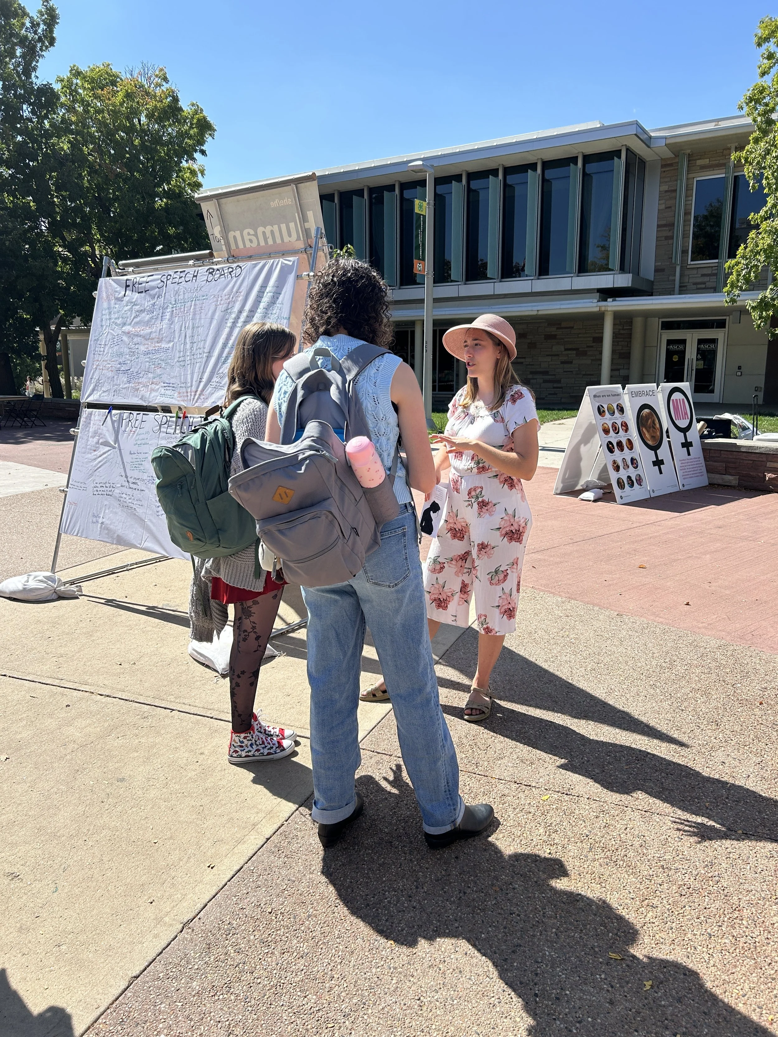 Martha (left) interacts with students at the University of Kansas in 2025.
